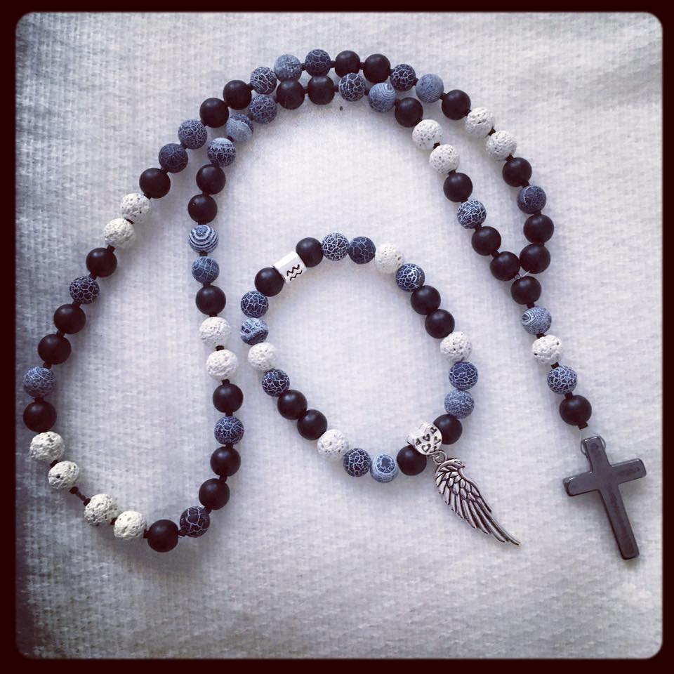 náhrdelník z přírodních korálků láva, onyx a achát s křížem z hematitu